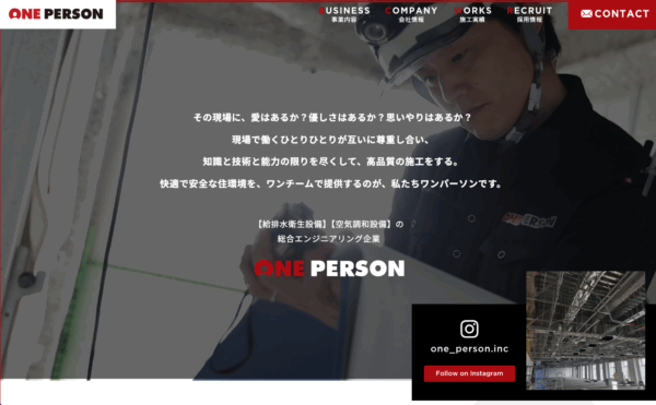 ワンパーソン株式会社は、給排水・空調設備の総合エンジニアリング企業。住宅やビル・マンションに欠かせない給排水や空調などインフラ設備の工事、修理、保守、点検、調査、建設業における管工事などを手がけている会社です。