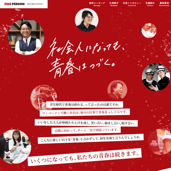 ワンパーソンでは、いい年した大人が仲間たちと汗を流し、笑い合い、励まし合い、助け合い、目標に向かって、チーム一丸で頑張っています。「仕事は、楽しくするもの」。一人ひとりの得意を活かして日々成長を続ける、そんな同社の雰囲気を少しでも感じてもらえるようにしました。社員の顔が見えるサイトにすることで、求職者にも安心してもらえ、応募獲得へと繋げられるようにしています。