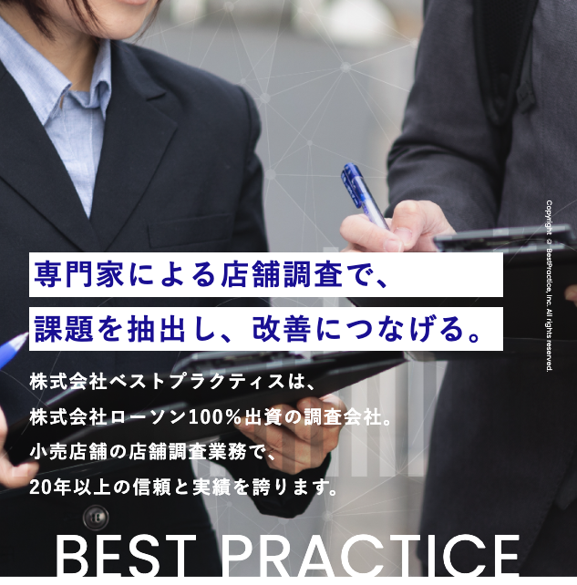 株式会社ベストプラクティスは、小売店の店舗調査事業を行う株式会社ローソン100%出資の調査会社です。全国のコンビニエンスストアの覆面調査では、20年以上の信頼と実績を誇っています。